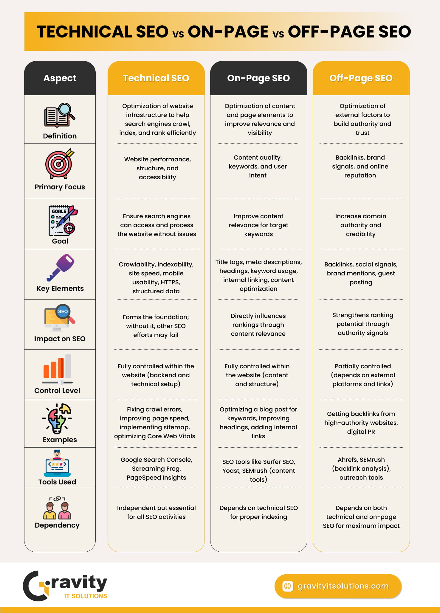| Aspect | Technical SEO | On-Page SEO | Off-Page SEO |